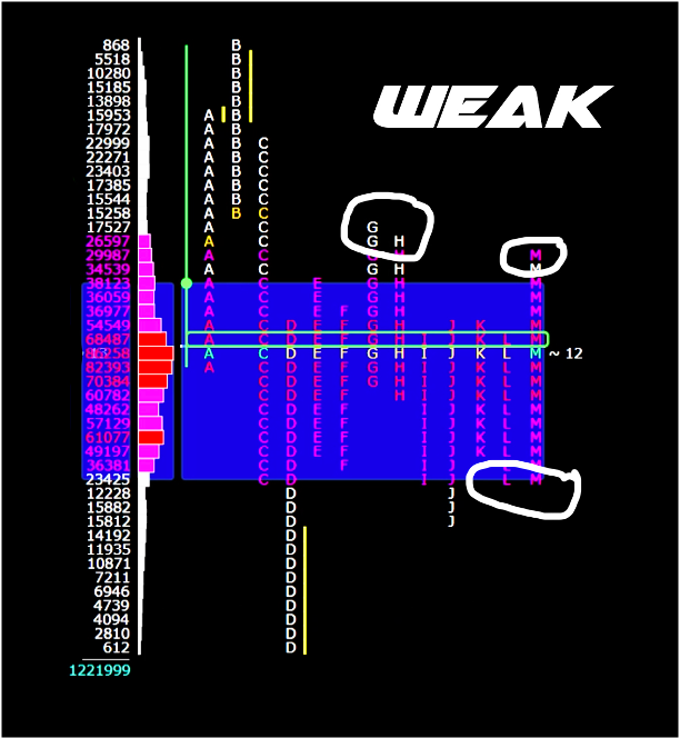 A Weak High is formed when the market creates a high on a TPO within one letter of a previous technical or profile level. For example; highs/lows of previous 30 minute TPOs, previous day’s highs/lows, the previous day’s settlement, or the current session’s open.