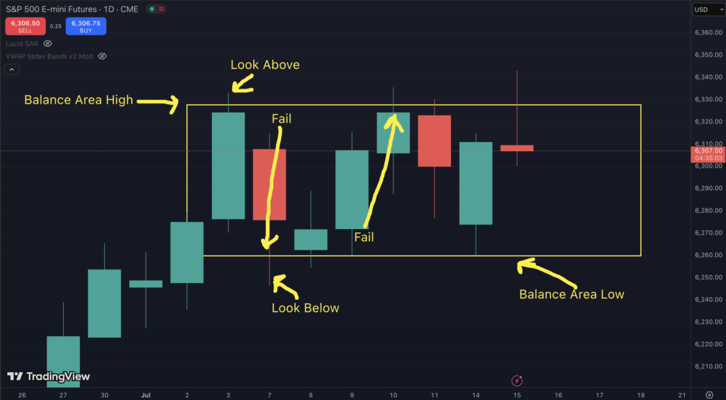4. Look below and fail: Prices move below the low of the balance area, but find support and push back up into the balance area. This is now a long with a stop below the new low the market just made below the previous balance area low, with a target to the opposing end of balance, the balance area high.
